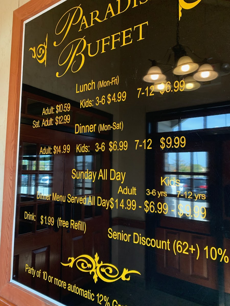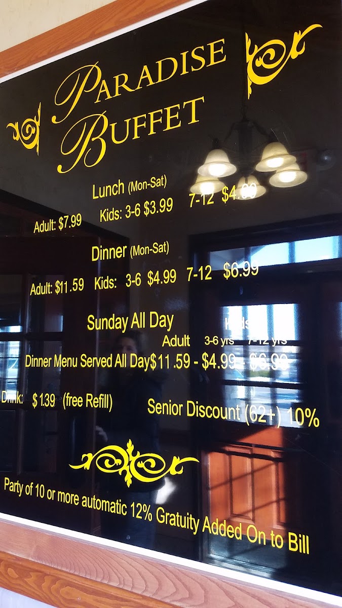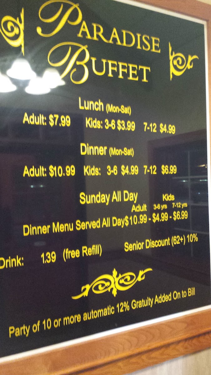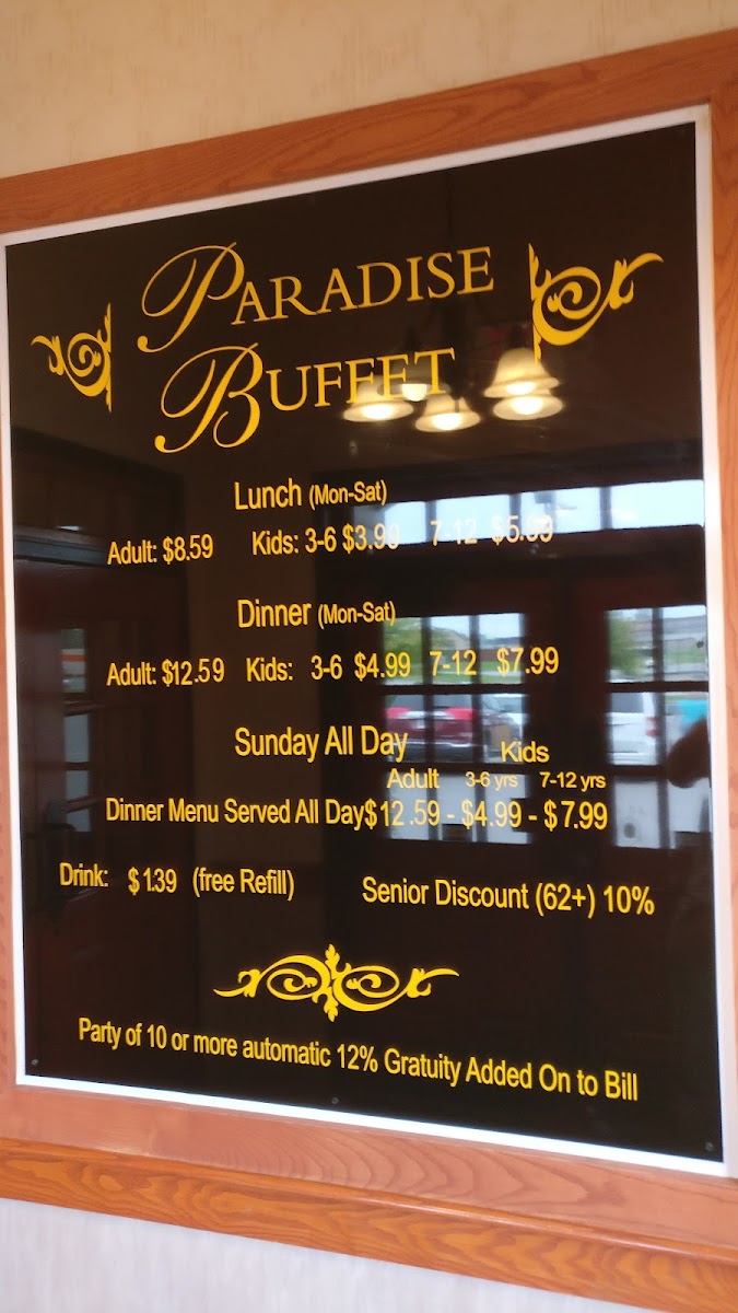 The menu at Paradise Buffet offers a wide selection designed for casual, satisfying dining in a spacious and relaxed setting. This buffet-style experience invites guests to explore a variety of dishes at their own pace, perfect for both leisurely lunches and hearty dinners.