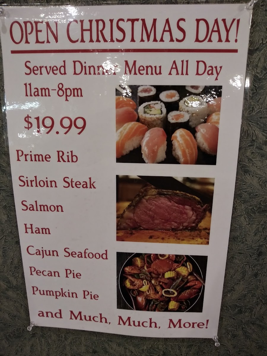 You’ll find a mix of comforting classics and fresh, flavorful options—from savory prime rib and sirloin steak to a diverse array of seafood like crab legs and Cajun-style dishes. The spread also includes familiar favorites like macaroni and cheese alongside more unique items such as frog legs, sushi, and jalapeno chicken spring rolls. A well-stocked salad bar and a chocolate fountain add lighter and sweet touches that suit a wide range of tastes and mealtime moods.