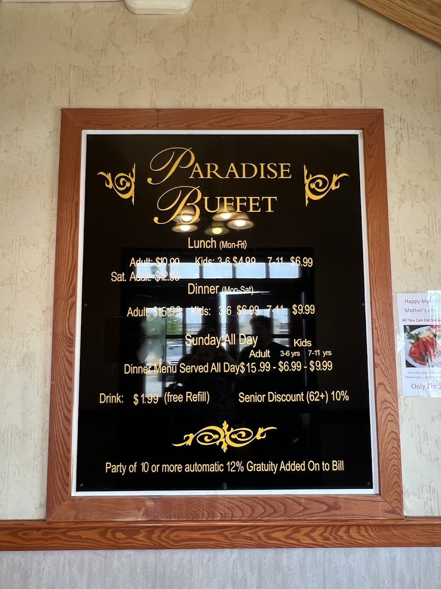 The atmosphere of Paradise Buffet encourages a relaxed, unhurried experience where guests can enjoy hot, replenished stations in a clean, open dining space. Whether you’re visiting for a casual weekday meal or a special occasion, the variety and freshness of the offerings complement the inviting environment, making it easy to find something enjoyable for any appetite or time of day.